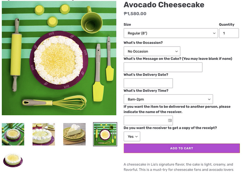 Below, we decided to go against best practice and added 6form fields on a product page of a client. It worked for them as this market wanted a lot of customization (i.e. it’s a cake ecommerce store and we added the message, the number of candles, events, and ideal time for delivery fields)